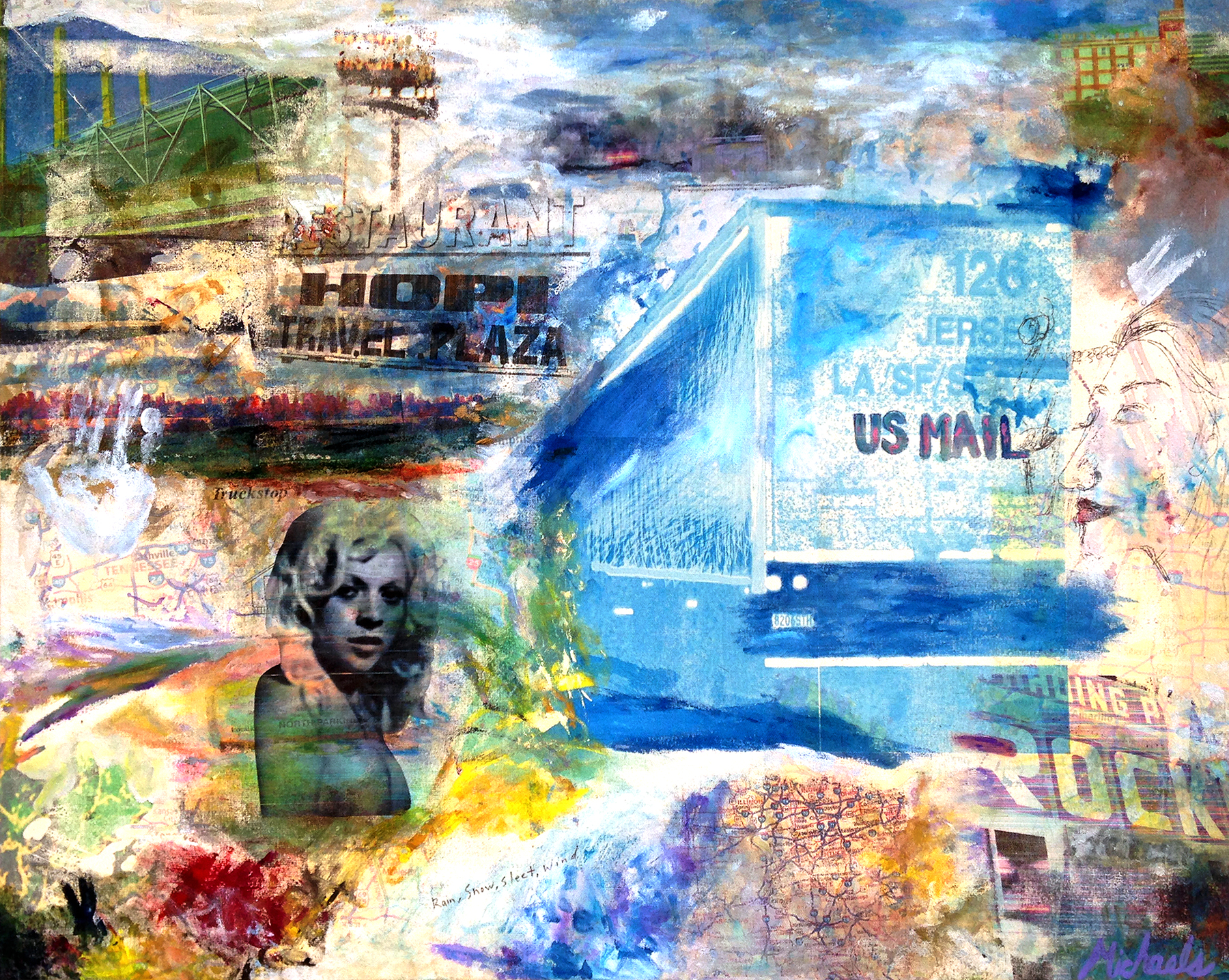 “Road Tripping” mixed media paintings by Jill Carey Michaels are inspired by the uniquely American experience of driving coast to coast on the interstate as billboards, truckstops and skylines rush past the car window. Ms. Michaels integrates images of retro sheik women into her panoramic roadscapes, layering colorful paint strokes with iconic symbols, words and found objects, creating an intriguing world.